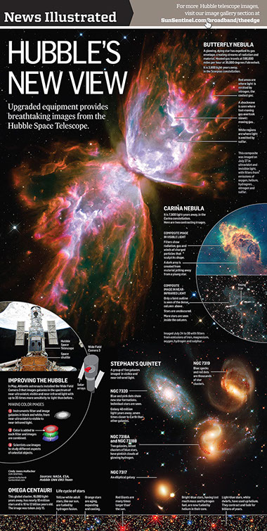 Beautiful NASA photos is a blessing for design. My goal was to give readers a design worthy of the awe inspiring heavens above. The graphic described some of the recent changes to the Hubble Telescope and explained how images are taken and what they show.